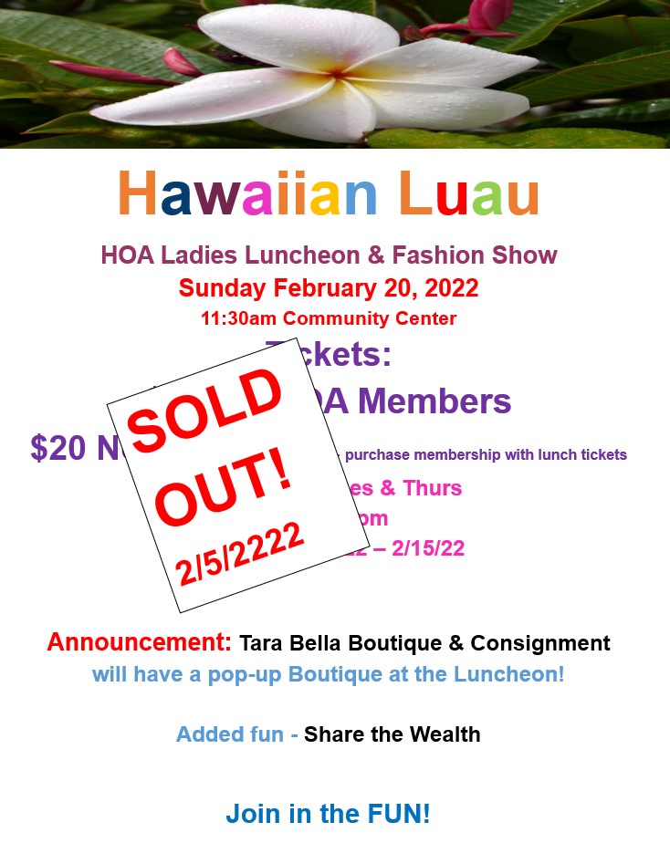 A HUGE “THANK YOU” goes to the HOA for allowing us to provide “SHARE THE WEALTH” at various HOA events, and for the generous donation from their GOLF BALL sales