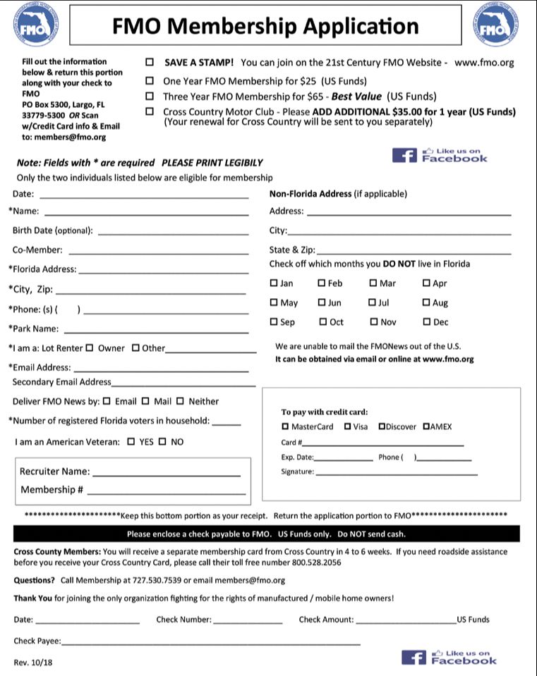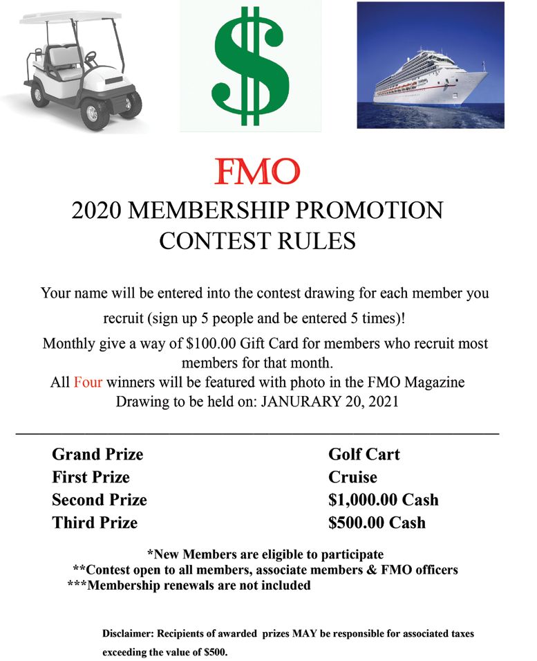 January 13, 2020 FMO Membership contest New FMO ( Florida Manufactured Home Owners Assoc ) can enter to win a golf cart when joining. below for information and membership form